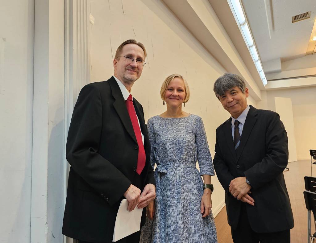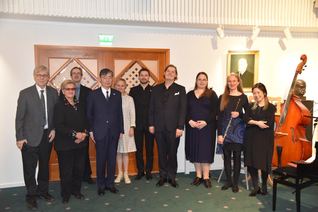 Opening concert of FinJa Music in Helsinki Finnish Club 8th of November, 2022. In the photo, from left: host Seppo Kimanen, chairman of Finnish Japanese Society Marketta Forsell, composer Ari Romppanen, His Excellency the Ambassador of Japan Kazuhiro Fujimura, composer Lotta Wennäkoski, pianist Justas Stasevskij, cellist Lauri Rantamoijanen, pianist Sari Blå, flutist Hanna Kinnunen, and pianist Mariko Furukawa.