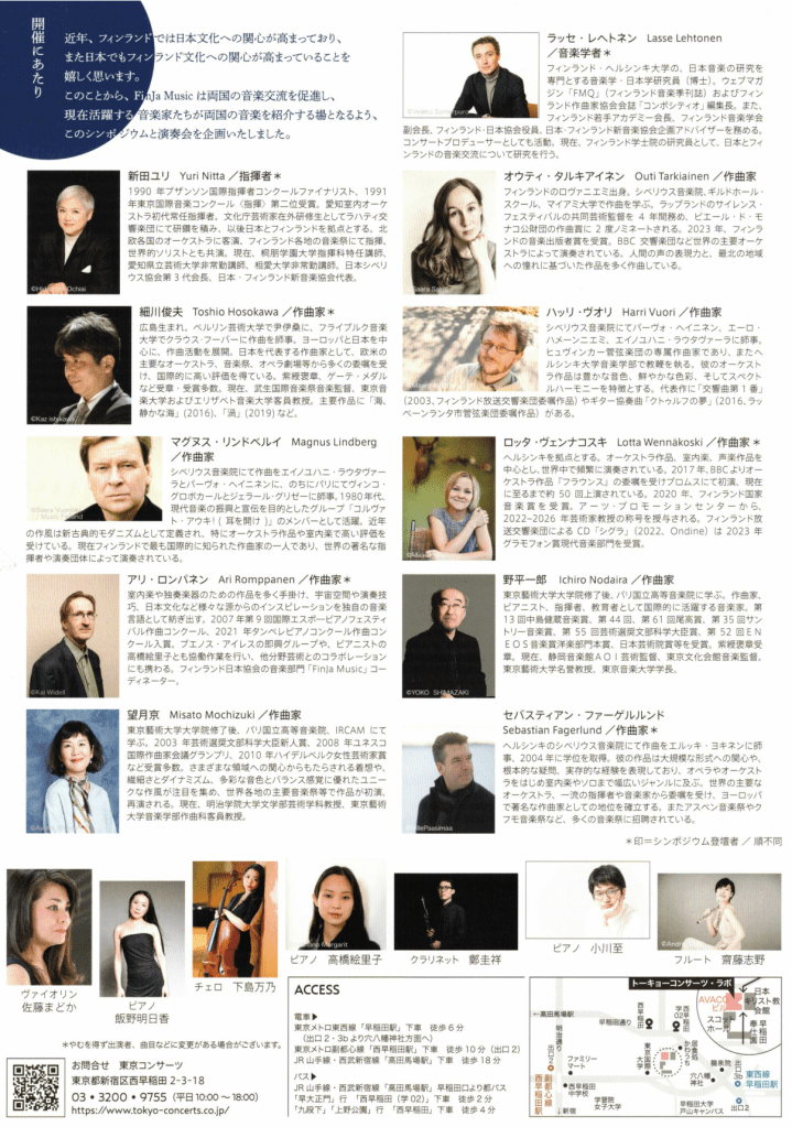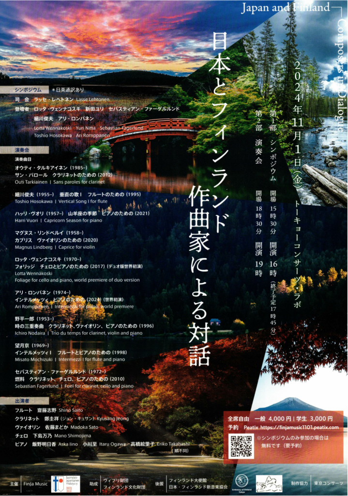 Flyer of symposium ”Japan and Finland – Composers in Dialogue”, organized by FinJa Music in Tokyo Concerts Lab, 1st of November, 2024.